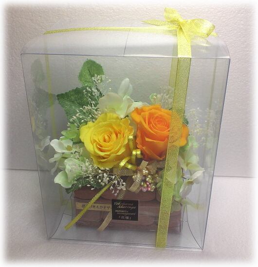 ● クリアケース (巾12㎝×奥行12㎝×高さ16㎝)に収納され、黄色のリボンがされています。