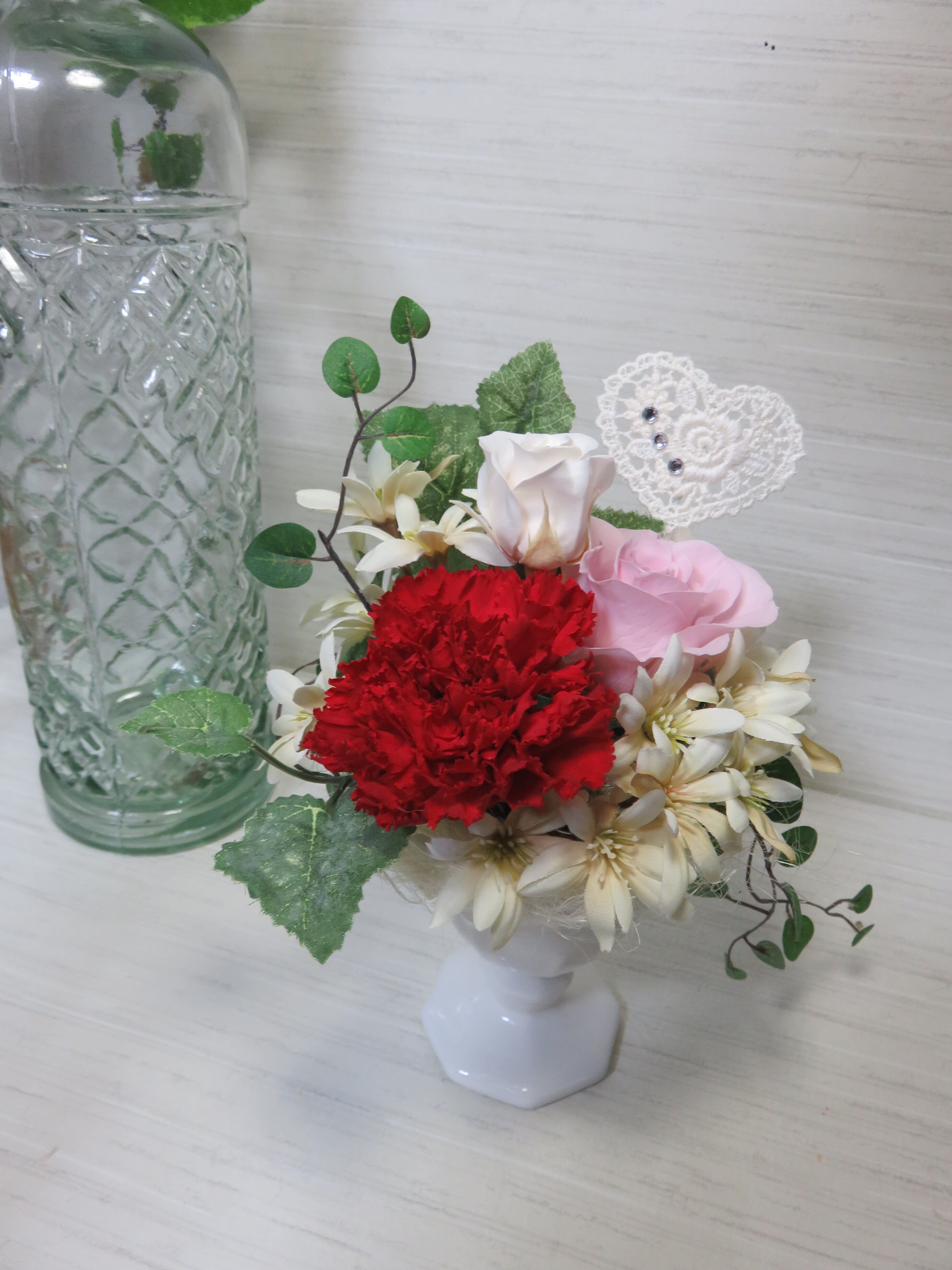 ● 使用材料 プリザードブドフラワー(カーネーション1輪・バラ大1輪・小1輪)、アーティフィシャルフラワー(デイジー)、ピック(レース)を使用しています。