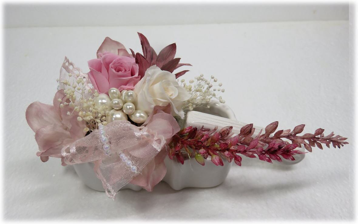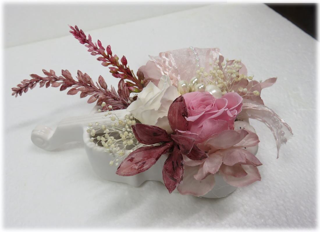 白い陶器のバイオリン花瓶にプリザードバラ2輪をアレンジした可愛いい商品です。